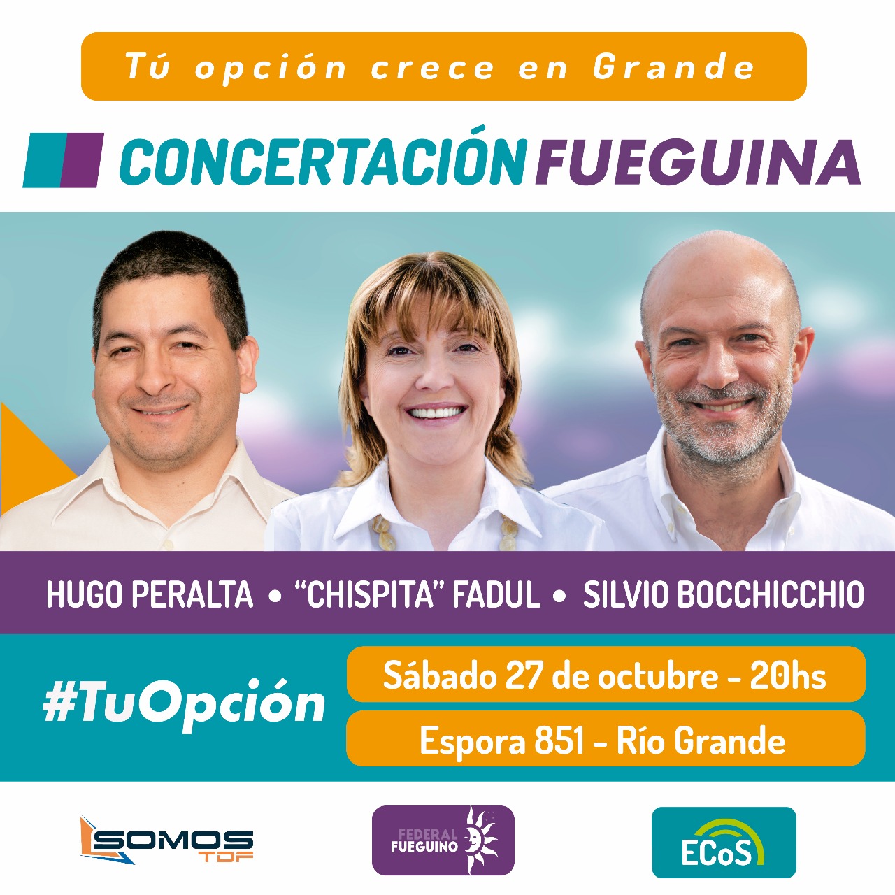 La Concertación Fueguina, coalición integrada por el Partido Federal Fueguino y el Espacio de Concertación Social, incorporará desde este sábado 27 de octubre al partido Somos Tierra del Fuego, en un acto a realizarse en calle Espora 851 desde las 20 horas en Río Grande.