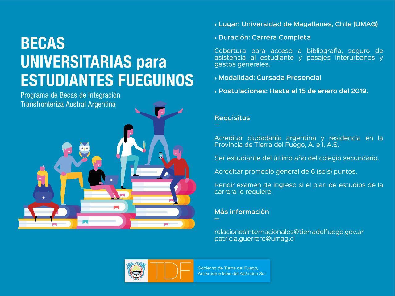 La Universidad de Magallanes (UMAG) conjuntamente con la Agencia de Cooperación Internacional de Chile por medio del Programa de Becas de Integración Transfronteriza Austral Argentina ofrecen diez becas para cursar estudios completos en los Centros Universitarios de la UMAG, sitos en Punta Arenas, Puerto Natales y Porvenir.