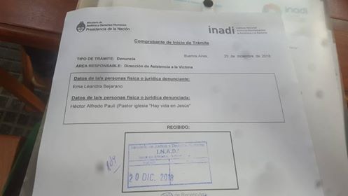 Juev 20/12/18.- Ema Bejarano, integrante de la Colectiva De Igual a Igual, viajó a Ciudad Autónoma de Buenos Aires, donde fue recibida por autoridades del INADI -Instituto Nacional contra la Discriminación, la Xenofobia y el Racismo- lugar en que ingresó la denuncia formal contra el pastor evangélico Héctor Alberto Pauli.