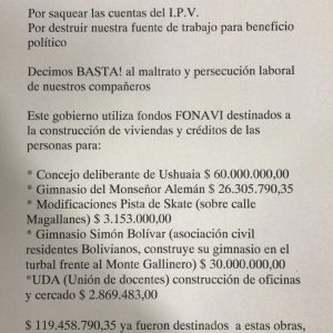 Desde la semana pasada los empleados del Instituto Provincial de Vivienda vienen denunciando a través de panfletos una serie de irregularidades dentro de ese ente provincial, dentro de las cuales se encuentran maltrato laboral, persecución y la utilización de mas de 119 millones de pesos de fondos del FONAVI para obras que no tienen nada que ver con la construcción