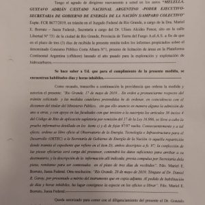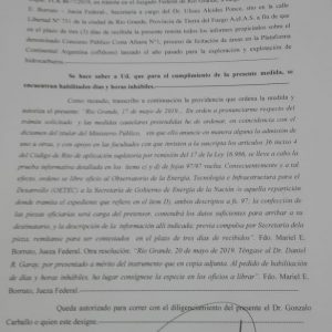 Juev 23/05/19.- La Jueza Federal Dra. Mariel Borruto envió 2 oficios a OETEC y la Secretaria de Energía de la Nación, solicitando documentación sobre empresas que estén en infracción sobre el plexo normativo de la presentación y también sobre estudios de impacto ambiental para la explotación hidrocarburifera en las Islas Malvinas.