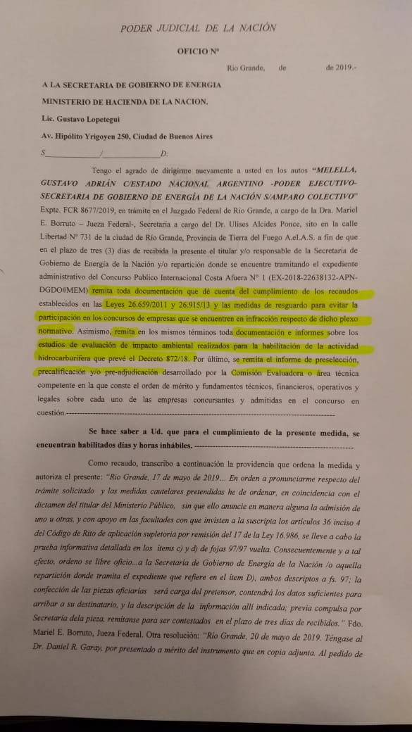 Bajo la caratula, Melella Adrian Gustavo c/Estado Nacional, sobre amparo colectivo, la Jueza Federal de Rio Grande, Dra. Mariel Borruto envió 2 oficios al Observatorio de Energía, Tecnología e Infraestructura para el desarrollo (OETEC) y la Secretaria de Energía de la Nación a fin de que remitan toda la documentación con que cuenten para evitar la participación en concursos de empresas que se encuentren infracción respecto de dicho plexo normativo