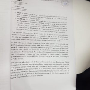 En las conclusiones expresa que “no existe degradación irreversible” y que “el tratamiento de vertidos en el cuerpo receptor con miras al cumplimiento de parámetros de calidad de las descargas es una gestión que corresponde al ente encargado de la construcción, instalación y operación de plantas de tratamiento, acciones y obras que no le corresponderían al Municipio de Río Grande por estar éstas asociadas a las redes troncales y no a las redes de distribución que sí se encuentran a cargo del Municipio”.