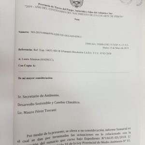 Dando por terminadas las actuaciones en relación con la investigación del sumario, Ruiz eleva al Secretario de Ambiente, Desarrollo Sostenible y Cambio Climático, Mauro Pérez Toscani el informe completo y el modelo de resolución correspondiente para realizar los requerimientos al Municipio, a la DPOSS y conformar la comisión tripartita.