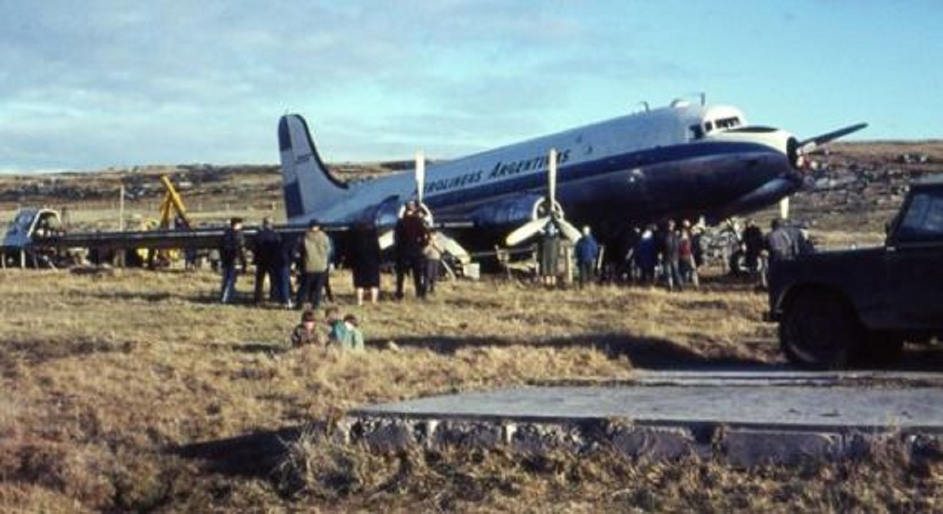 Por ello, cuando el aparato LV-AGG apareció sobre el villorrio de Puerto Stanley (Argentino) a las 08:45 aproximadamente, nadie sospechaba que minutos después, la nave de considerable porte – longitud 29m, envergadura 36m y pesando 35 mil kilos – aterrizaría sobre la tierra de la estrecha y limitada franca del “hipódromo” en el sector oeste del pueblo. En la misma cancha de carreras cuadreras, que el aviador santacruceño Miguel Fitzgerald había aterrizado sorpresivamente con su avioneta Cessna 182, Luis Vernet, dos años antes (longitud 8,84m, envergadura 11m).