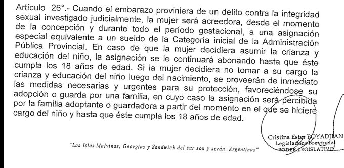 Esta aberración lleva la firma de la legisladora provincial Cristina Boyadjian y es un insulto a la independencia de las mujeres, al derecho a decidir, al respeto por el ser humano, y una apología del abuso sexual, ya que acepta que un hijo producto de una violación ya que el gobierno provincial se haría cargo de un hijo no deseado hasta los 18 años. Un proyecto que retrotrae a lo peor del patriarcado, pero por sobre a colocar a la mujer en un espacio realmente vergonzante, humillante en pleno siglo XXI.
