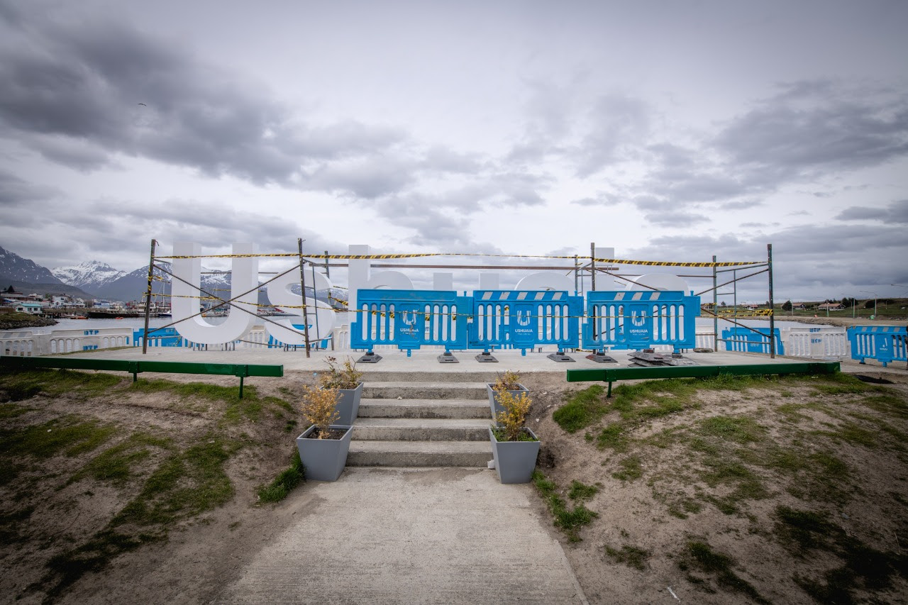 Juev 24/10/19.- La Municipalidad de Ushuaia a través de la Secretaría de Planificación e Inversión Pública realiza trabajos de mantenimiento y reparación en el cartel Ushuaia, con el apoyo de empresas privadas.