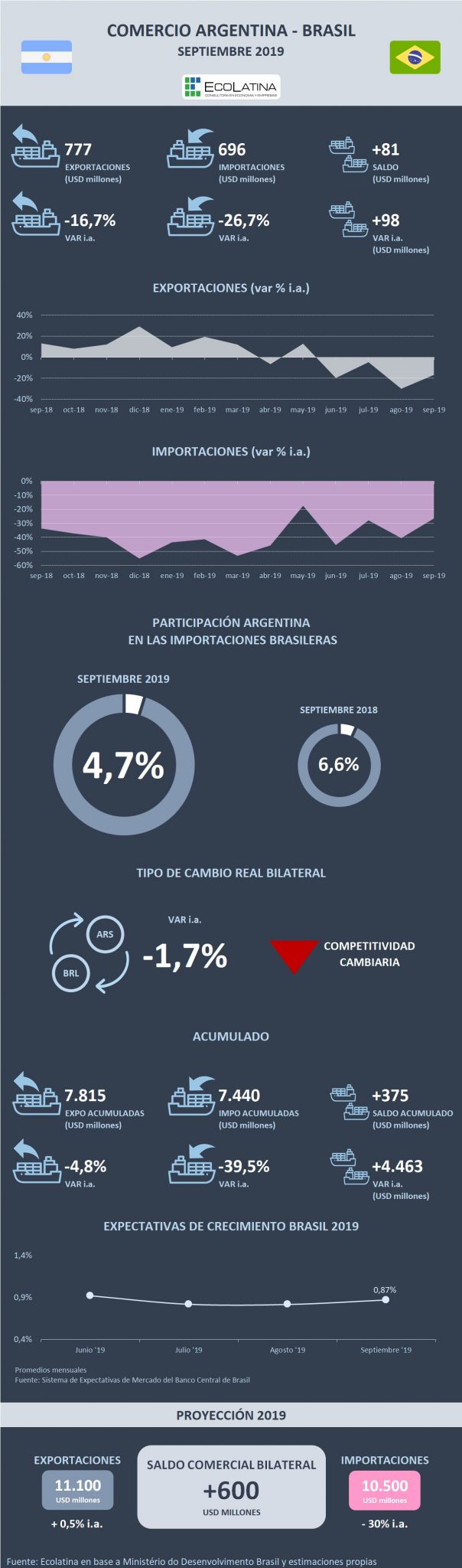 Mart 01/10/19.- En septiembre de 2019, la balanza comercial bilateral entre Argentina y Brasil volvió a permanecer prácticamente equilibrada (USD +81 millones), manteniéndose casi inalterada en relación a igual mes del año pasado (USD -17 millones).