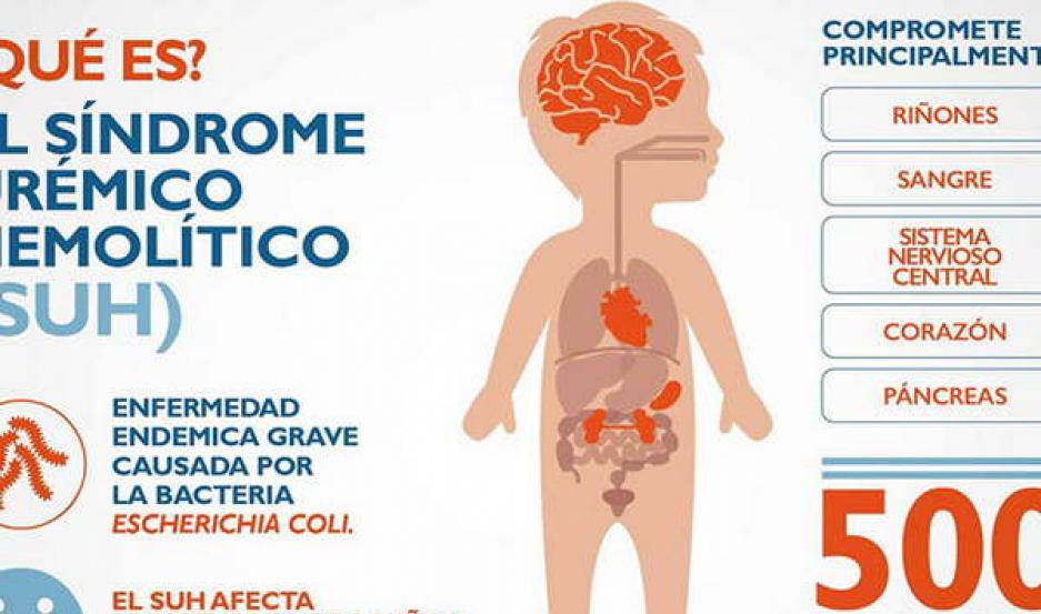 El SUH se trata de una enfermedad producida frecuentemente por una bacteria (Escherichia coli), caracterizada por diarrea, con o sin sangre, dolor abdominal, vómitos y fiebre, palidez, disminución en la eliminación de orina, decaimiento o irritabilidad y, en bebés, niños y niñas más pequeños, el rechazo al alimento. Esta bacteria se encuentra en las carnes crudas o mal cocidas, superficies contaminadas con este alimento, en verduras mal lavadas o lácteos no pasteurizados.