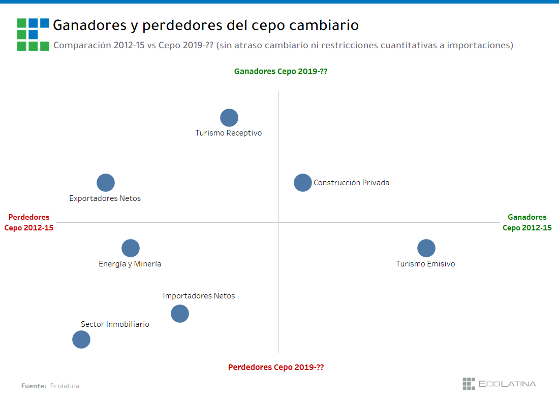 Otros de los sectores perjudicados por el cepo cambiario fueron los exportadores netos, siendo la actividad más emblemática la agroindustria. Por un lado, cargaban con elevadas retenciones en un contexto de fuerte atraso cambiario y, por el otro, recibían ingresos valuados al dólar oficial, mientras que parte de sus costos dolarizados crecían en línea con el dólar paralelo (la brecha entre ambas cotizaciones promedio el 40% entre 2012 y 2015). Si bien, aunque en el cepo actual rigen menores retenciones, lo cierto es que la competitividad cambiaria se encuentra cercana al promedio histórico y que la brecha cambiaria aún no es importante. De esta forma, que los exportadores se configuren como claros perdedores del cepo dependerá de que vuelvan las condiciones vigentes en el pasado.