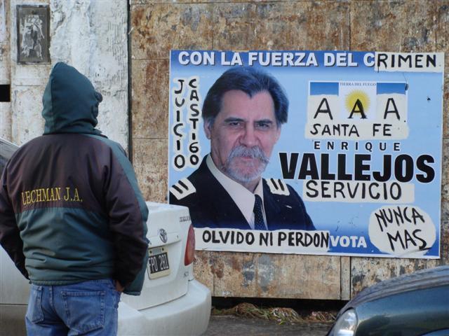 Rio Grande- A pesar de lo llamativo de las imágenes colgadas en las paredes de Ushuaia, ningún medio se hizo eco del escrache a Enrique Vallejos, denunciado por organizaciones de derechos humanos de la Provincia de Santa Fe, por su participación como personal civil de inteligencia en la última dictadura militar. En Tierra del Fuego, nadie se expreso al respecto ni siquiera la Secretaria de Derechos Humanos, ni otras asociaciones. Los afiches aparecieron sobre la Calle San Martín de la capital fueguina y es la primera vez que ocurre.