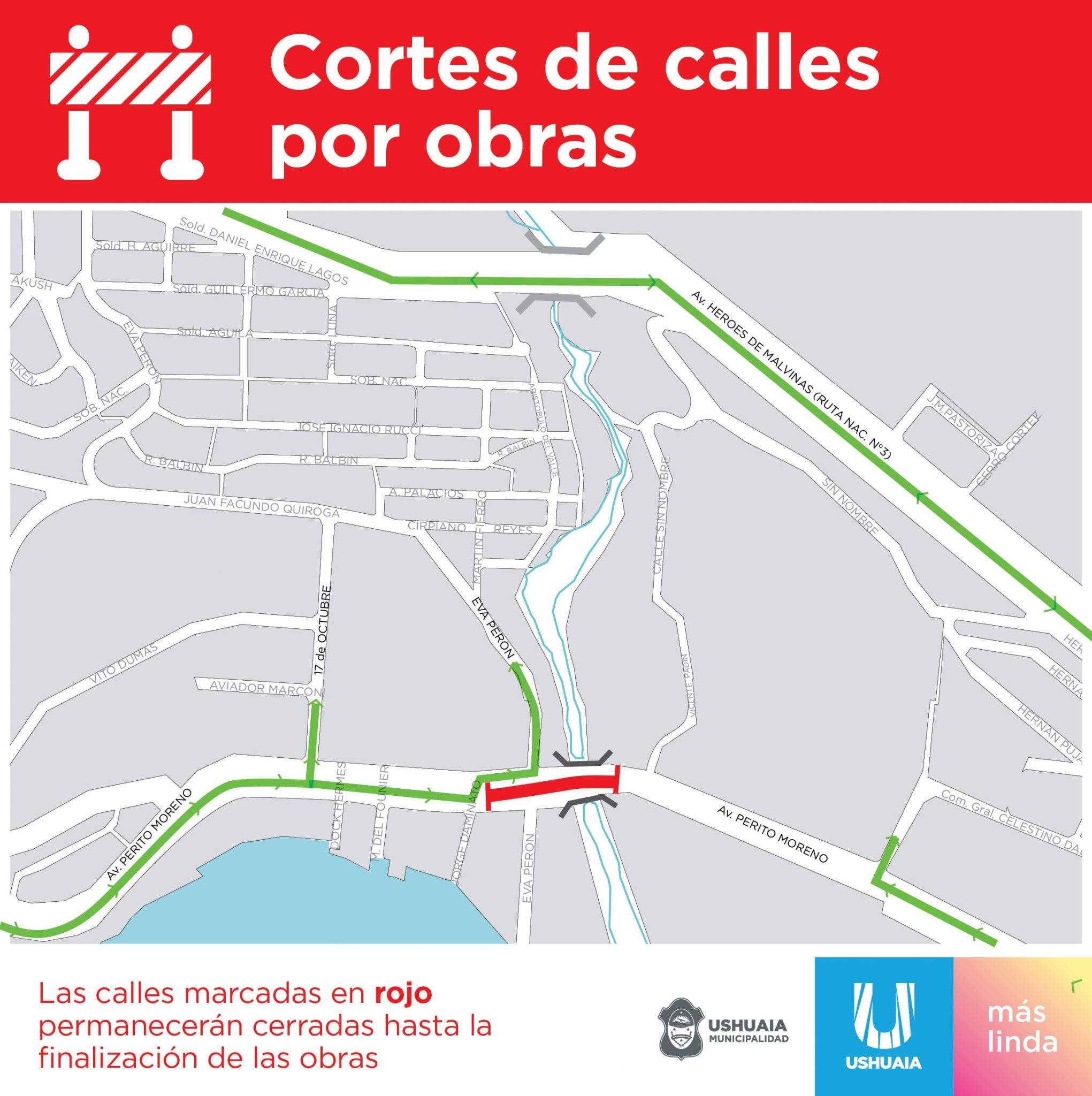 Mart 14/01/2020.- La Municipalidad de Ushuaia comunica que a partir del jueves 16 de enero quedará cortado al tránsito el paso del puente sobre el arroyo Grande, ubicado en la avenida Perito Moreno. La medida obedece al inicio de las obras que completan la ampliación de la avenida que se realiza con hormigón y doble carril por mano. Se estima que el lugar permanecerá vedado al tránsito por un mes, por lo que se recomienda utilizar la avenida Héroes de Malvinas como vía de tránsito habitual.