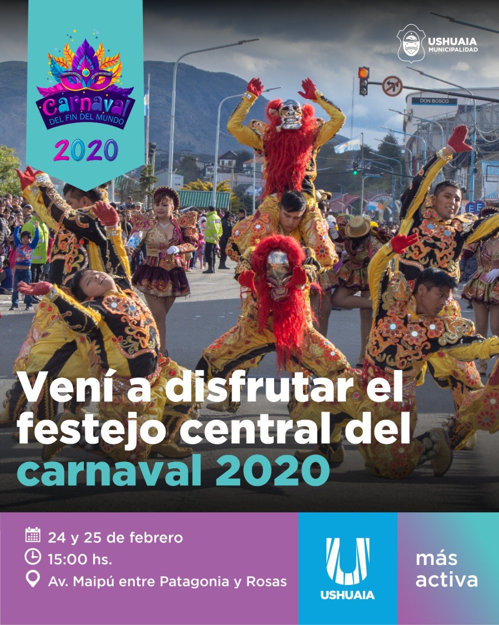 Finalmente, los días 24 y 25 de febrero, que son feriado nacional, el color y la alegría de los carnavales se traslada al centro de la ciudad, donde las 13 expresiones que participan de esta edición, desfilarán por Avenida Maipú entre Patagonia y Rosas a partir de las 15.00 hs. Se pide a los automovilistas que estén atentos a los cortes programados para dichos días y se invita a toda la familia de Ushuaia y a sus visitantes a sumarse a los festejos que son abiertos y gratuitos para todos y todas.