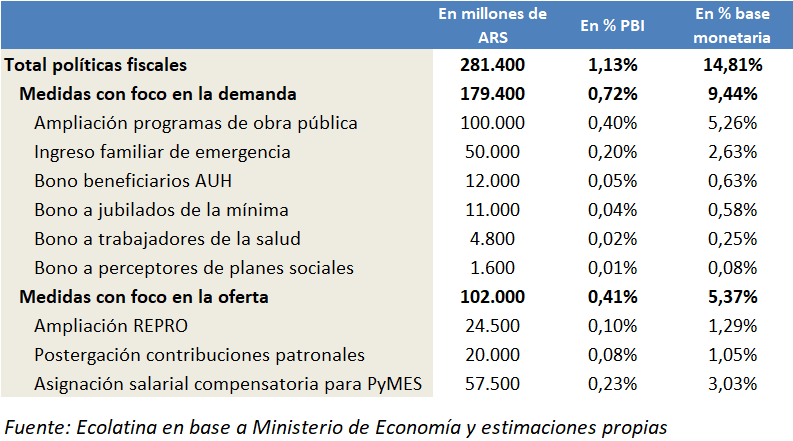 Al momento, el programa lanzado por el gobierno implicaría poco más de 2% del PBI, es decir, cerca de ARS 600.000 millones. Esta cifra representa un tercio de la base monetaria promedio de marzo y la mitad del circulante. No obstante, sólo el aumento del déficit fiscal -alrededor de 1% del PBI- se financiará con pesos emitidos para la ocasión.
