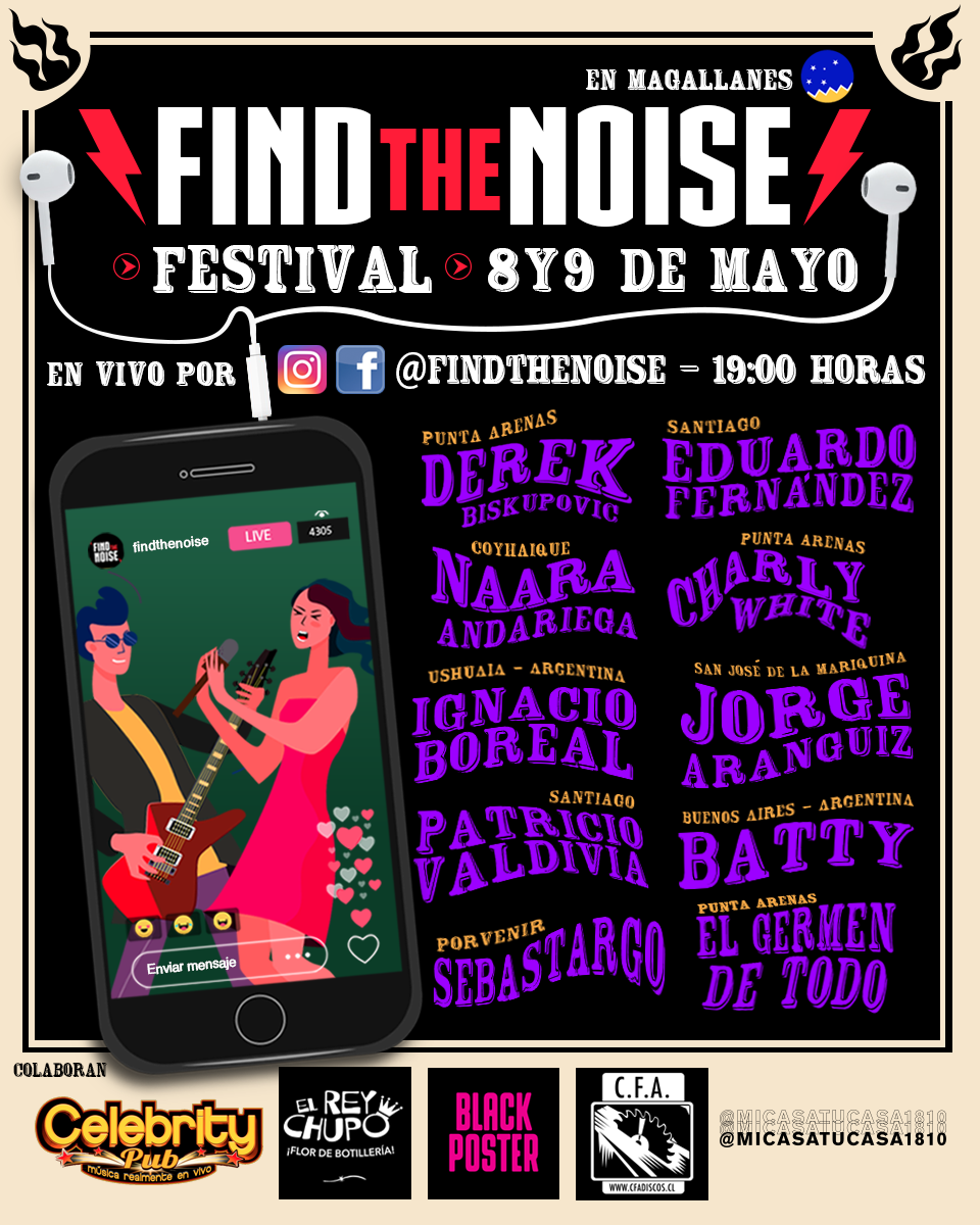 Sebastian «Batty» Paz (Buenos Aires, Argentina), Naara Andariega (Coyhaique, Chile), Eduardo Fernández (Santiago,Chile), Jorge Aránguiz (San José de la Mariquina, Chile), Ignacio Boreal, (Ushuaia, Argentina), Patricio Valdivia (Santiago, Chile) Sebastargo (Porvenir, Tierra del Fuego, Chile), Derek Biskupovic (Punta Arenas, Chile) Charly White, (Punta Arenas, Chile), El Germen de Todo (Punta Arenas, Chile), son la mixtura que nos trae este «Find The Noise Festival 2020».