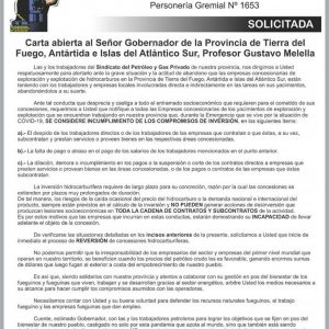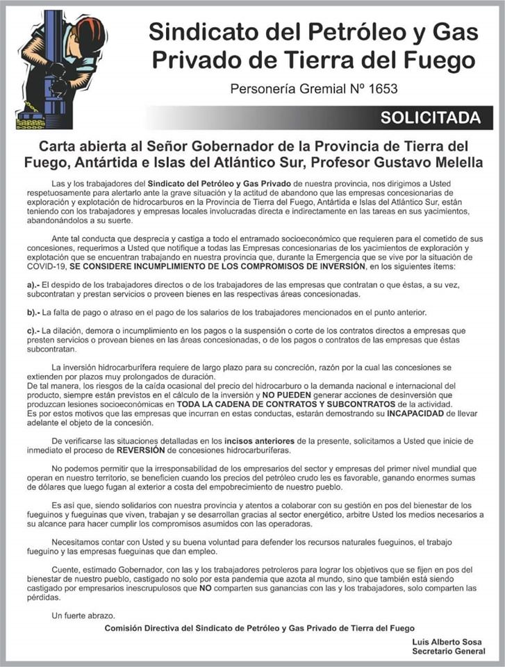 El secretario general del Sindicato de Petroleo y Gas Privado de Tierra de Fuego, envió una carta al Gobernador Gustavo Melella para que tome medidas ante una situacion que calificó como grave ya que las empresas exploradoras y explotadoras están dejando sus yacimientos librados a su suerte.