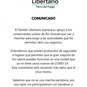 Viern 08/05/2020.- El Partido Libertario apoyara mañana la marcha que organizan los Comerciantes Unidos de Rio Grande a la hora 12:00 hs en la Plaza de las Americas en reclamo por la apertura de sus negocios.