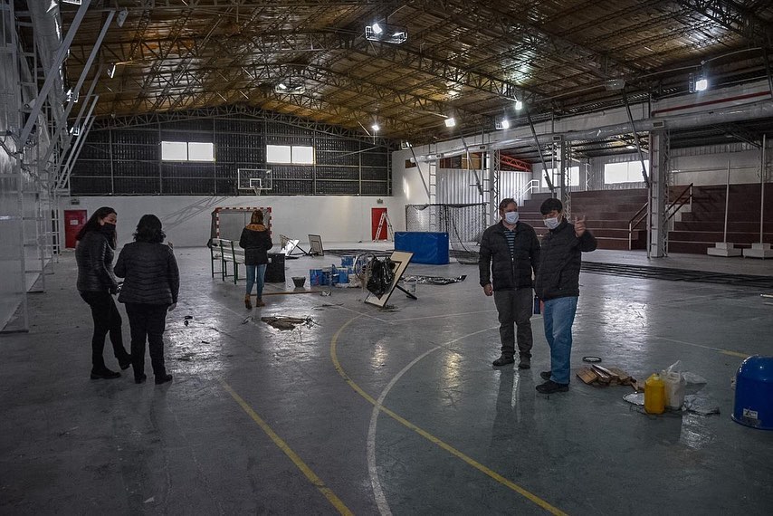 Sab 02/05/2020.- Avanzan las obras de adaptación del polideportivo Ezequiel Rivero de Tolhuin para utilizarlo como hospital en caso de ser necesario. Allí se esta realizando diversas tareas que fueron supervisadas por funcionarias del ejecutivo.