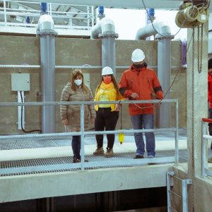La ministra de Obras y Servicios Públicos de la Provincia, Gabriela Castillo junto al presidente de la Dirección Provincial de Obras y Servicios Sanitarios (DPOSS), Cristian Pereyra, recorrieron las instalaciones de la nueva planta de pretratamiento de efluentes cloacales Bahía Golondrina, obra que se encuentra concluida y a la espera de entrar en régimen de operación continua. Pereyra estimó que esto podría ocurrir en «pocos meses».