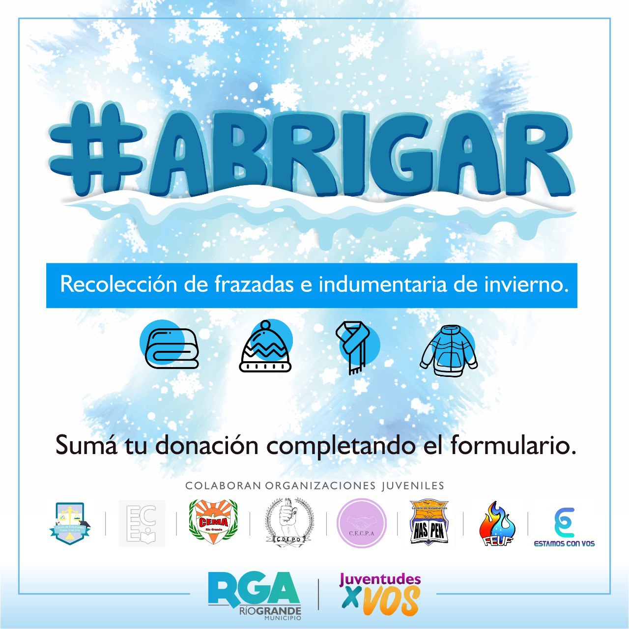 En el marco del programa “Juventudes X Vos” que lleva adelante la Dirección de Juventud del Municipio de Río Grande, en conjunto con diversas organizaciones juveniles, cientos de vecinos y vecinas de nuestra ciudad han sumado su colaboración a la Campaña ‘Abrigar’, la cual tiene como finalidad la recolección de frazadas e indumentaria de invierno para ser donadas a las familias que más lo necesiten.