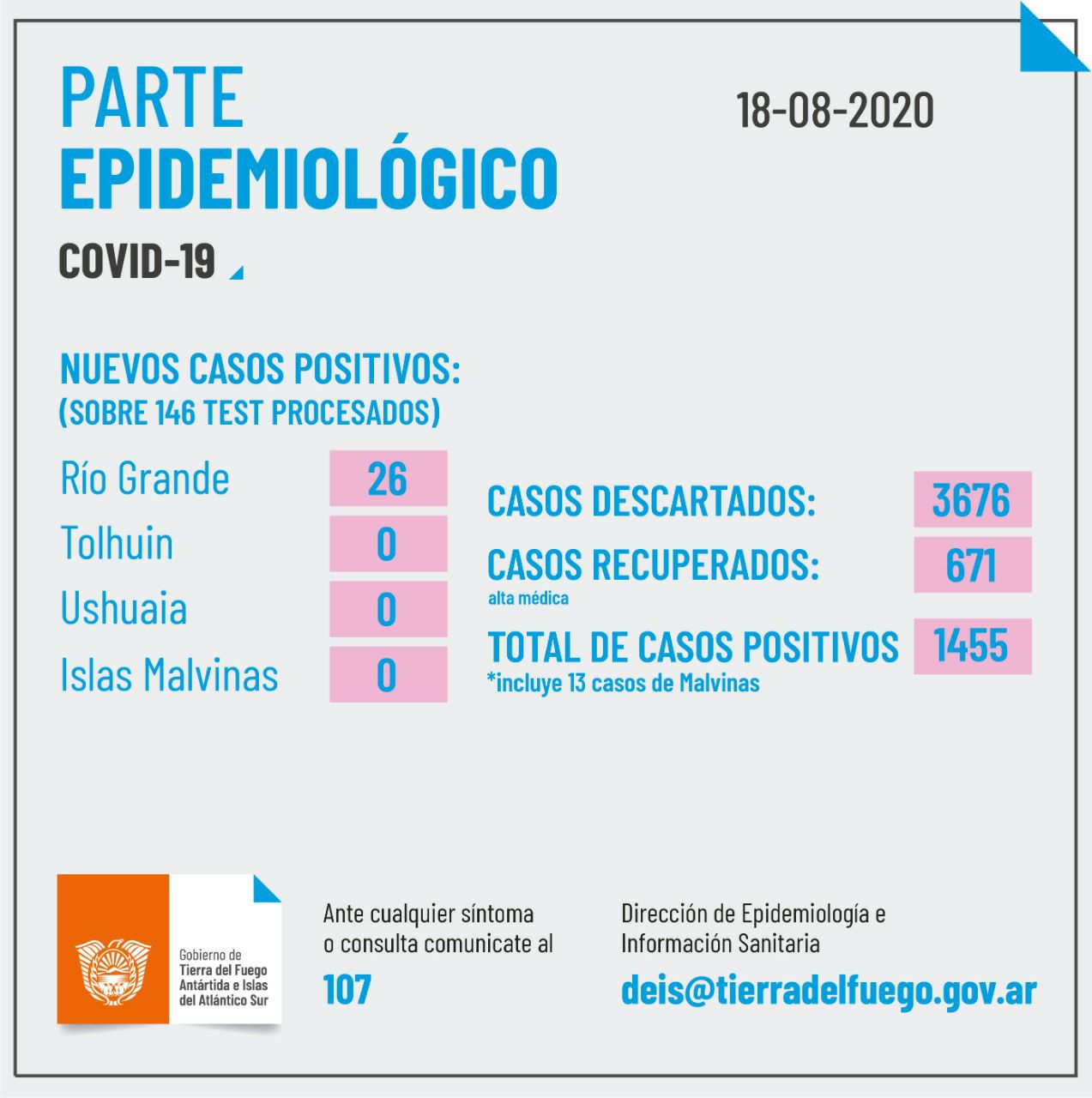 *TOTALIDAD DE CASOS CONFIRMADOS EN TIERRA DEL FUEGO A LA FECHA 1455* (*). Existe una diferencia con el parte nacional por una cuestión de carga de datos.