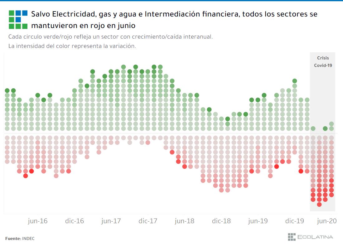 Juev 20/08/2020.- En junio de 2020, el Estimador Mensual de Actividad Económica (EMAE) mostró una contracción de 12,3% respecto a igual mes del año pasado. De esta manera, la actividad se desplomó casi 13% i.a. en la primera mitad del año y 21,4% i.a. en el fatídico segundo trimestre de pandemia y cuarentena (que arrojó una caída de 16,6% en términos desestacionalizados).