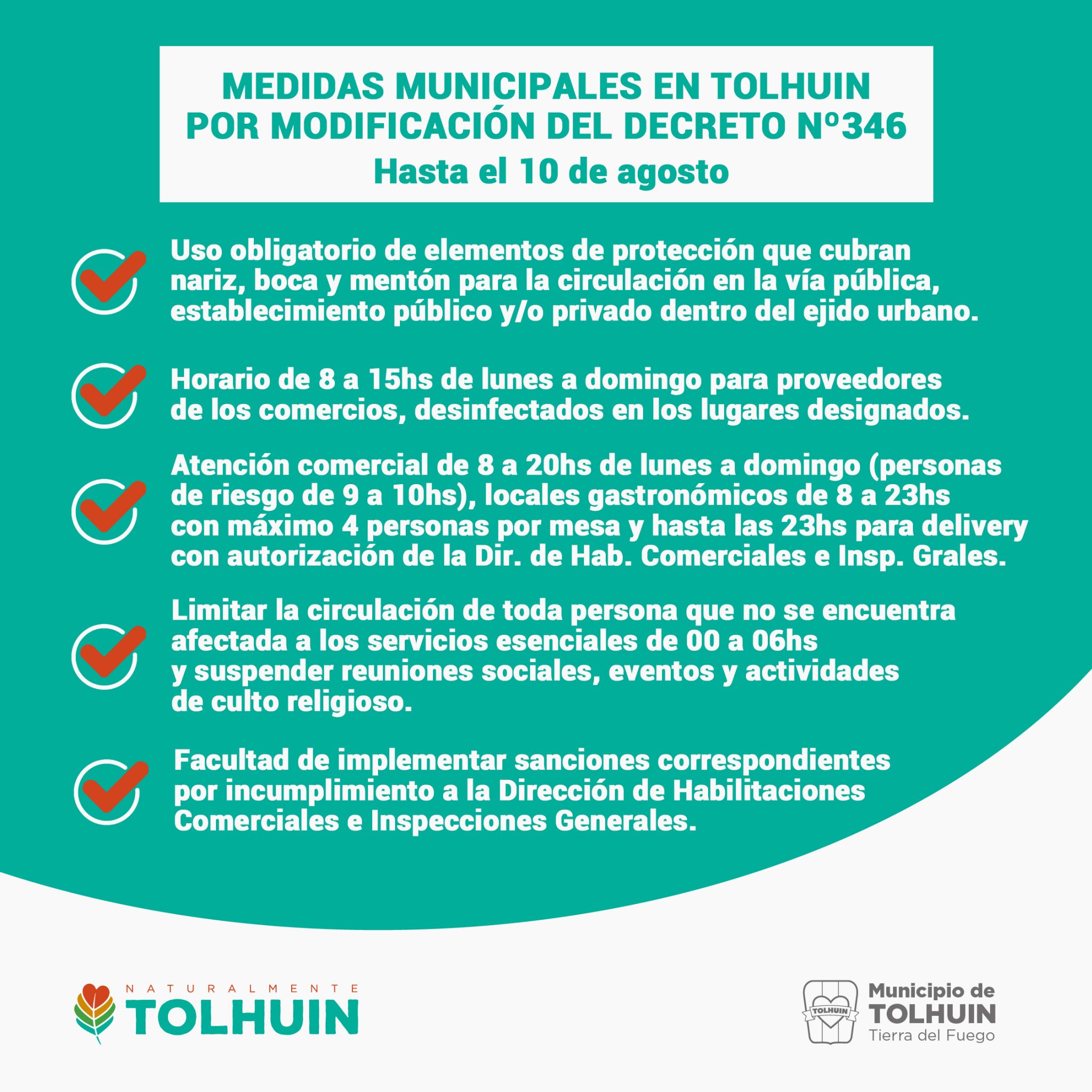 En base a las nuevas disposiciones provinciales, a través de la modificación del Decreto Municipal Nº 346, quedó establecido hasta el 10 agosto: