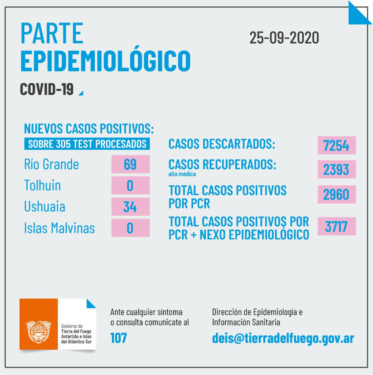 Sab 26/0972020.- La Dirección de Epidemiología e Información de la Salud del Ministerio de Salud del Gobierno de la Provincia de Tierra del Fuego, Antártida e Islas del Atlántico Sur informa el reporte diario provincial en relación a la pandemia por coronavirus Covid-19:
