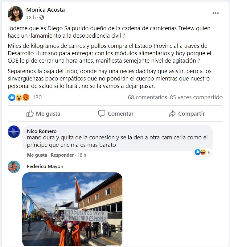 El posteo genero un gran debate entre quienes, como la Concejal Miriam MOra en Rio Grande tambien salio a atacar a quienes ya no tienen ningún ingreso o están cerrando sus negocios ante la inocultable y grave crisis que atraviesa la provincia.