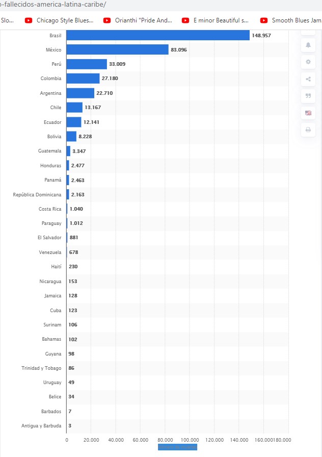El informe presentado por estatista.com al 9 de octubre señala la cantidad de fallecidos por covid-19 en latinoamérica y de ahí se extrae que Uruguay tiene sólo 34 casos, Chile 13 mil, Bolivia 8000, Argentina 22 mil, estos datos indican que  en 10 días en nuestro país fallecieron más de 4000 personas ya que hoy la cifra de muertos alcanza 26.267. Por encima de nuestro país se encuentra Brasil con más de 148 mil fallecidos, México más de 83 mil, Perú 33 mil y colombia con 27 mil.