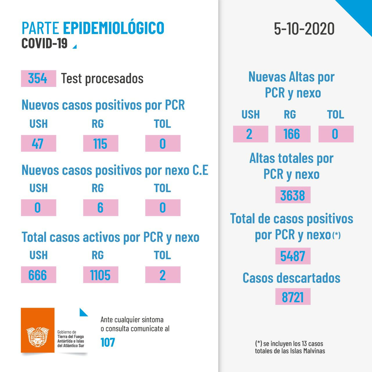 Ushuaia: 207 casos tienen nexo epidemiológico confirmado, casos en investigación 20 y casos con transmisión comunitaria 634.