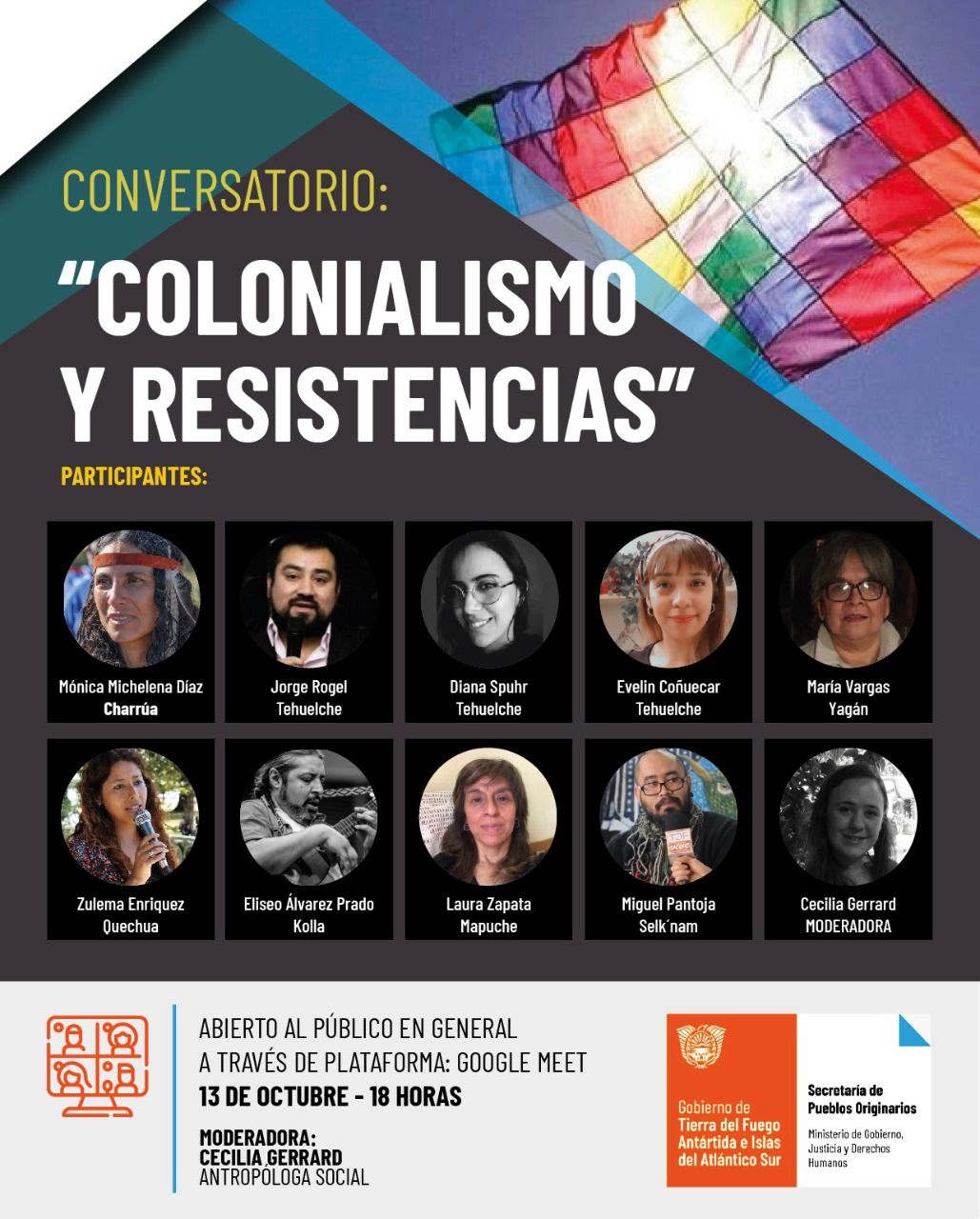 El encuentro se realizará el martes 13 de octubre a las 18 horas con la participación de Mónica Michelena Díaz – Charrúa, Jorge Rogel- Tehuelche; Diana Spuhr- Tehuelche; Evelin Coñuecar – Tehuelche; María Vargas – Yagán; Zulema Enriquez – Quechua; Eliseo Álvarez Prado – Kolla; Laura Zapata – Mapuche y Miguel Pantoja – Selk’nam