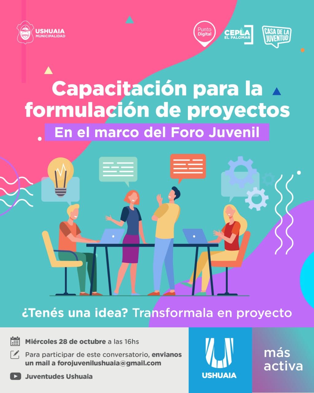 Ushuaia 28/10/2020.- En el marco del Foro Juvenil que impulsa la Municipalidad de Ushuaia, a través de la Secretaría de Polìticas Sociales, Sanitarias y Derechos Humanos, el miércoles 28 se llevará a cabo una capacitación para la formulación de proyectos.