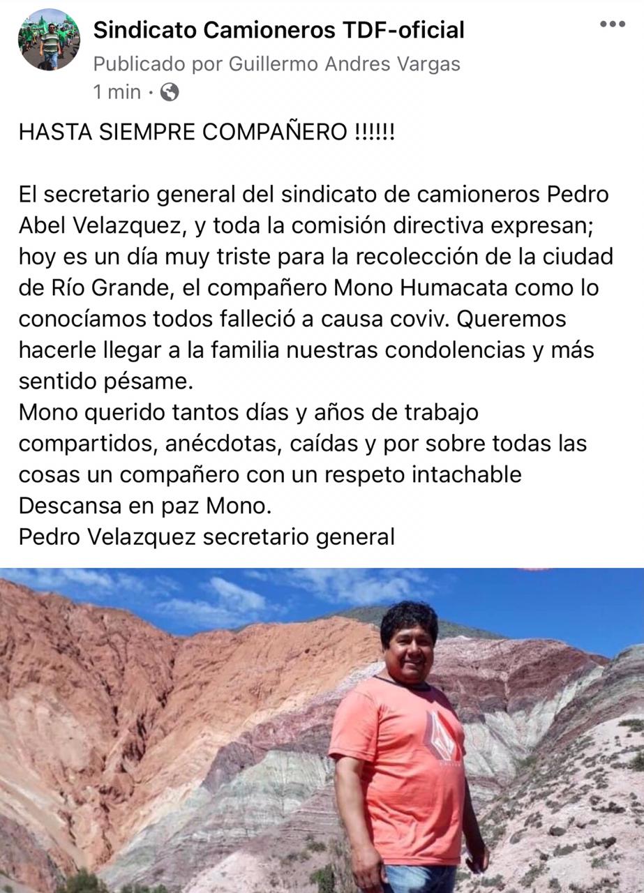 El secretario General del Sindicato de Camioneros, Pedro Abel Velázquez y la comisión directiva quieren hacer llegar sus mas sentido pesame y condolencias a los familiares de quien en vida fuera el afiliado Mono Humacata quien se desempeñó en la recolección de residuos de nuestra ciudad por más de 30 años.