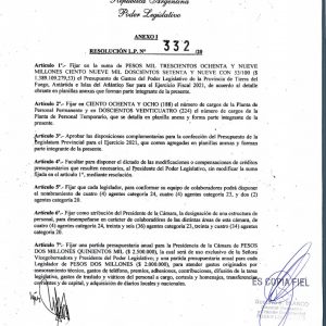 Según la resolución LP N°332/2020 adjuntando el Presupuesto de gastos del poder legislativo de la provincia de Tierra del Fuego, el mismo se distribuirá de la siguiente manera.