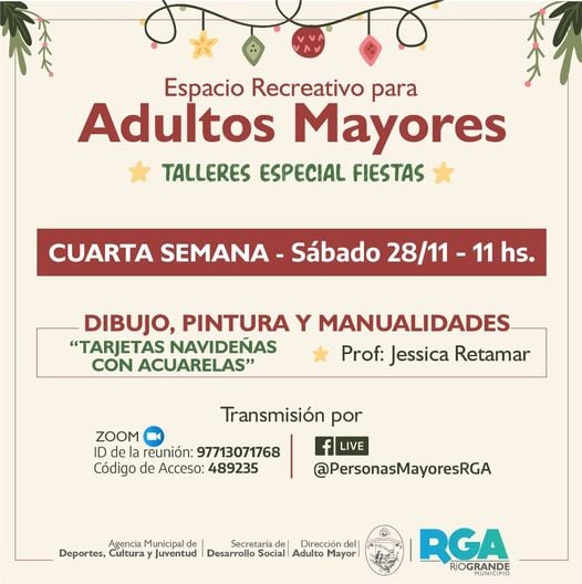 Este cuarto taller es sobre dibujo, pintura y manualidades. En el marco del ‘Especial Navidad’, se realizarán tarjetas navideñas con acuarelas. La lista de materiales se encuentra publicada en el Facebook de la Dirección del Adulto Mayor (@PersonasMayoresRGA).