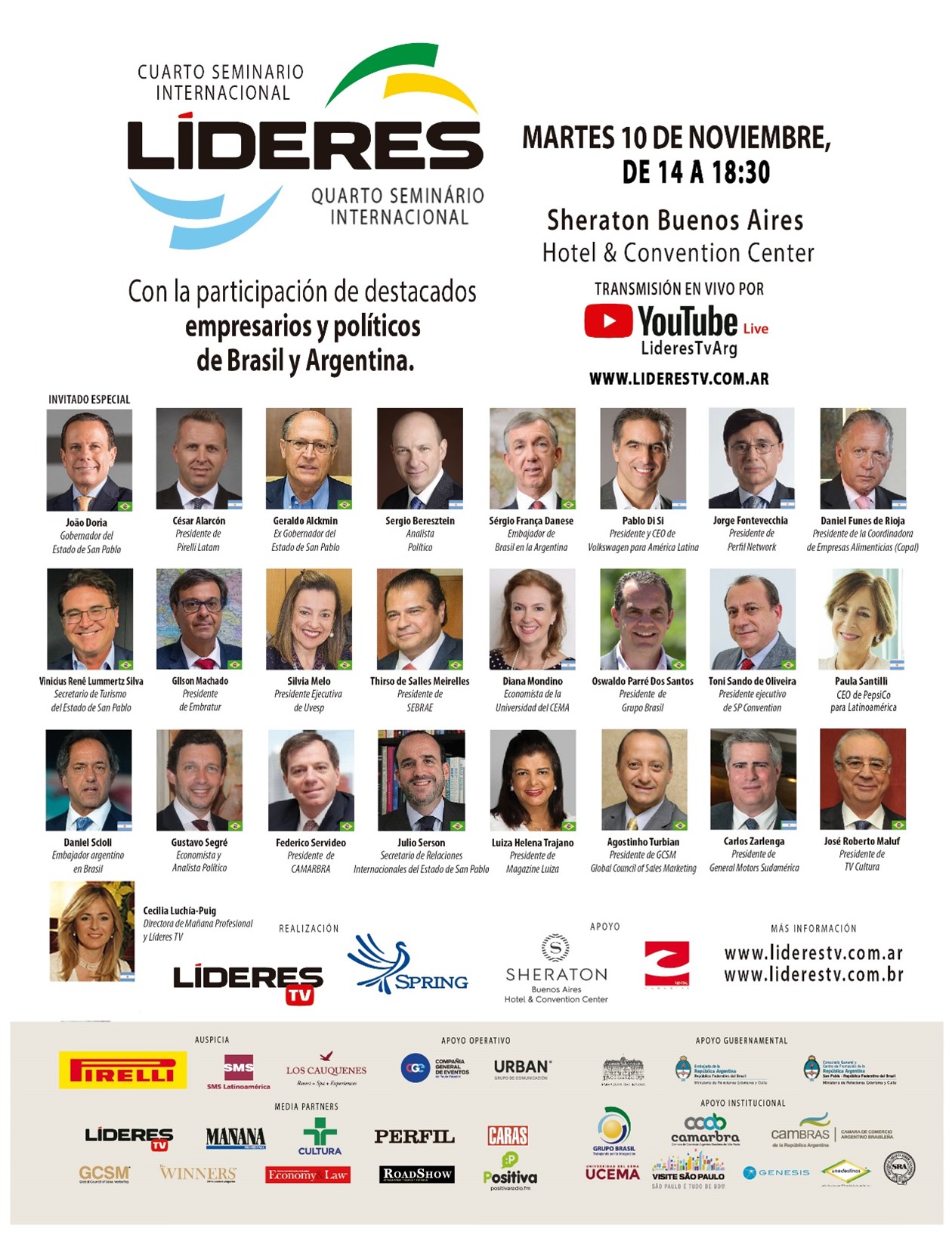 •   Contará con la presencia de figuras como João Doria, Gobernador del Estado de San Pablo, José Roberto Maluf, Presidente de la TV Cultura, Dr. Geraldo Alckmin, ex Gobernador de San Pablo, César Alarcón, Presidente de Pirelli LATAM, Paula Santilli, CEO de PepsiCo para Latinoamérica, Pablo Di Si, Presidente y CEO de Volkswagen para LATAM, Carlos Zarlenga, Presidente de GM LATAM,  Luiza Helena Trajano, Presidente de Magazine Luiza y Cecilia Luchía-Puig Directora de Líderes Tv y Mañana Profesional, entre otras personalidades.