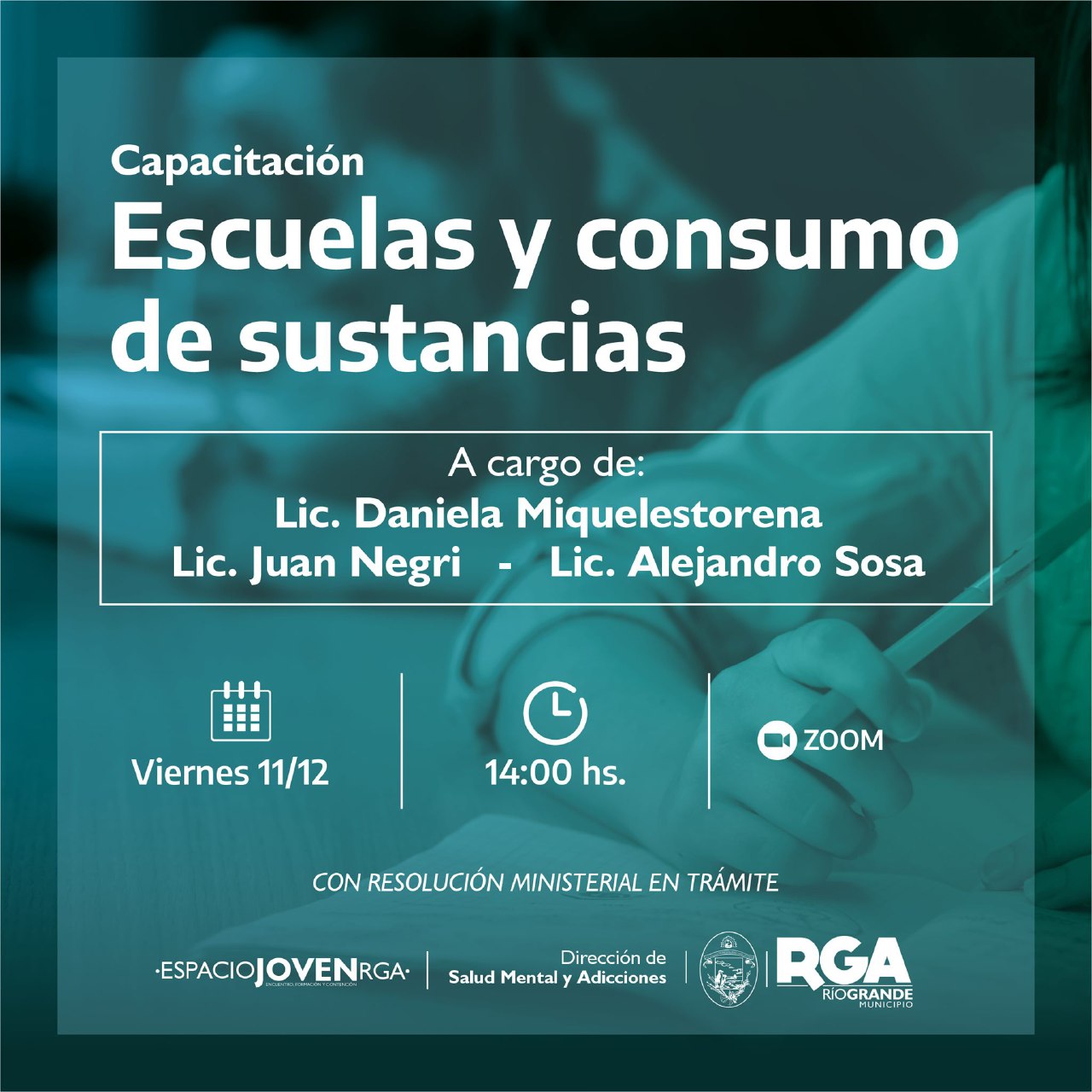 El Municipio de Río Grande, a través del trabajo mancomunado entre profesionales de la Dirección de Salud Mental y Adicciones, dependiente de la Secretaría de Salud, y Espacio Joven RGA, dependiente de la Secretaría de Gestión Ciudadana, lleva adelante el seminario “Escuelas y consumo de sustancias” desde el mes de julio. Las capacitaciones estuvieron a cargo de los licenciados Daniela Miquelestorena; Juan Negri y Alejandro Sosa, y culminarán este viernes 11 de diciembre.