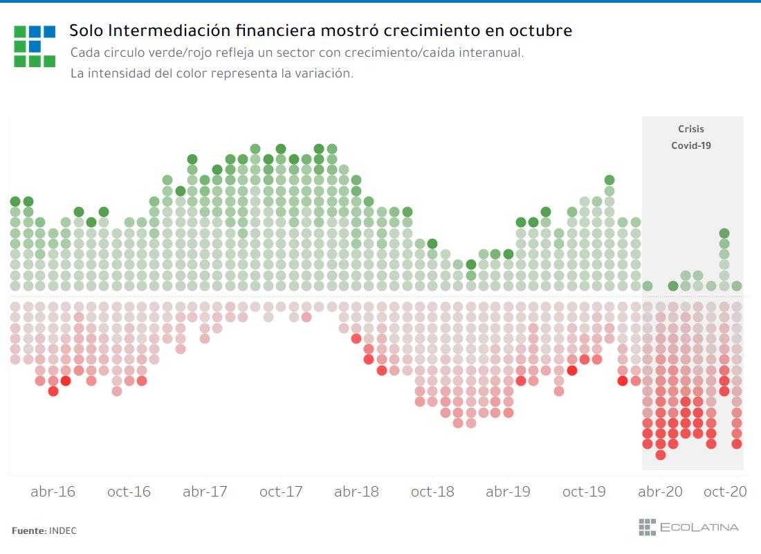 A nivel sectorial, la recuperación se ralentizó. Mientras que en septiembre 2020 seis sectores mostraron mejoras interanuales, en octubre solo uno (intermediación financiera) de quince mostró expansión.