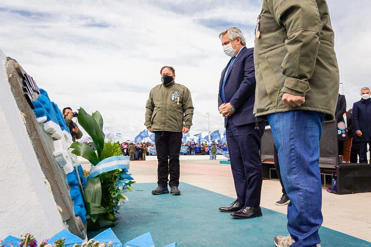 En el lugar, el Presidente colocó una ofrenda floral junto a Veteranos de Guerra. A su vez, Fernández; Melella; la Vicegobernadora; los 3 intendentes de la provincia; ministros nacionales y provinciales se sacaron la foto oficial.