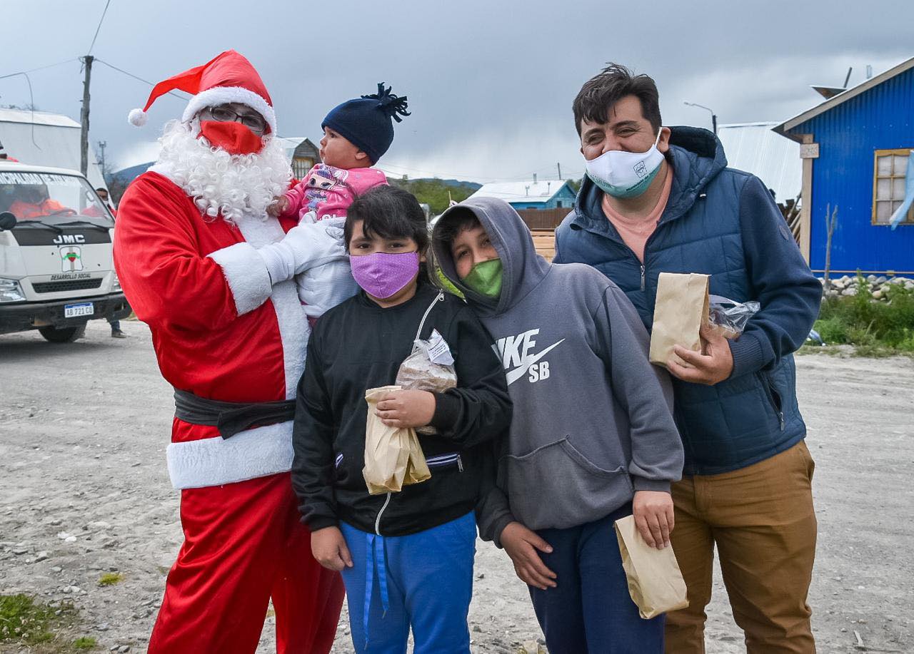 Con el objetivo de celebrar la navidad con los vecinos y vecinas de Tolhuin y tomando los recaudos protocolares correspondientes, durante la jornada del 24 Papá Noel acompañado del Intendente Daniel Harrington, los Concejales Rosana Taberna y Matías Rodriguez, y el equipo del Municipio visitaron cada barrio saludando a las familias, y entregando panes dulces y regalos para niños y niñas.