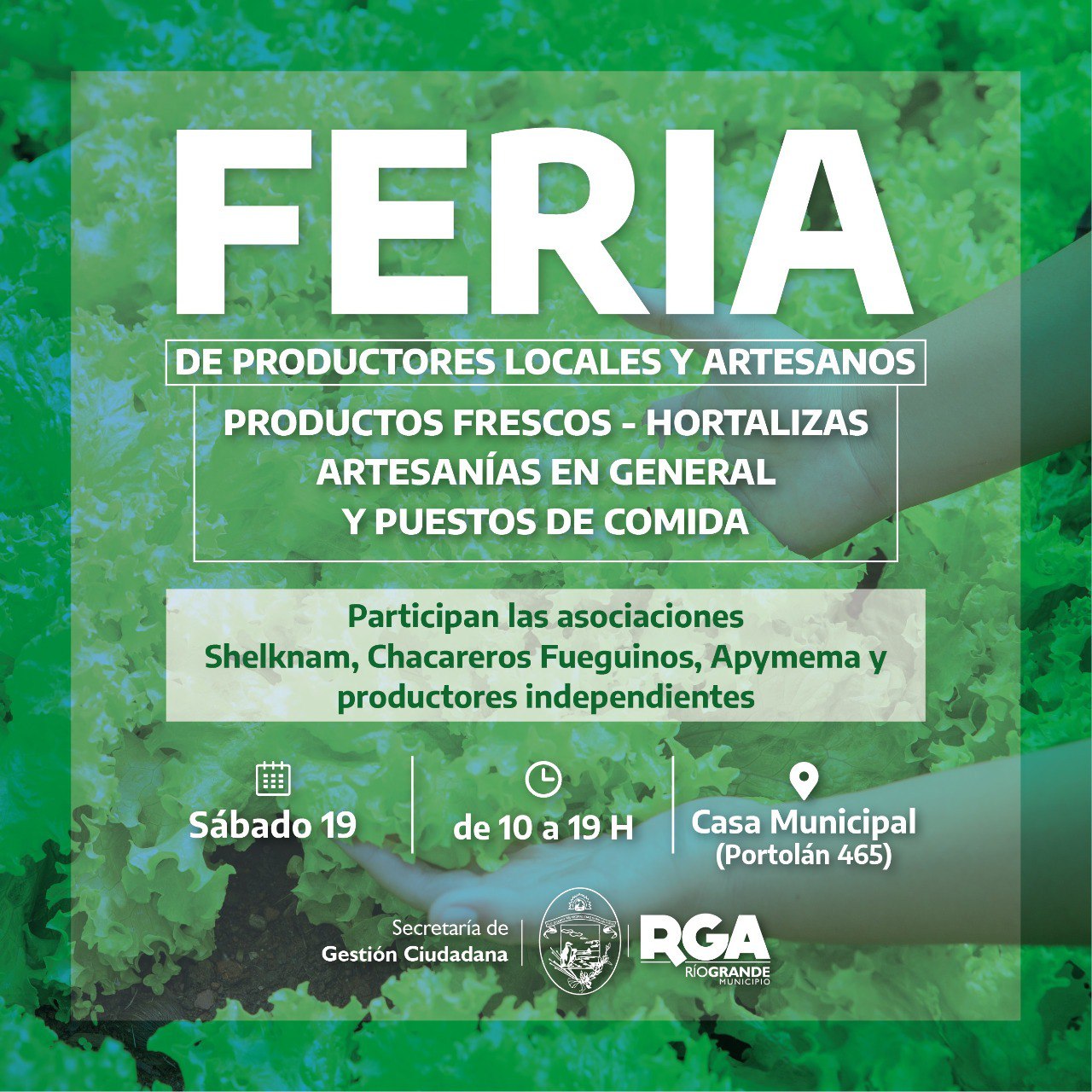 A través de la Secretaría de Gestión Ciudadana, el Municipio de Río Grande invita a los vecinos y vecinas a disfrutar y aprovechar de esta nueva Feria de Productores Locales y Artesanos, que se llevará a cabo este sábado 19 de diciembre, de 10 a 19 horas, en la “Casa Municipal” ubicada en el barrio CAP (Portolán 465).