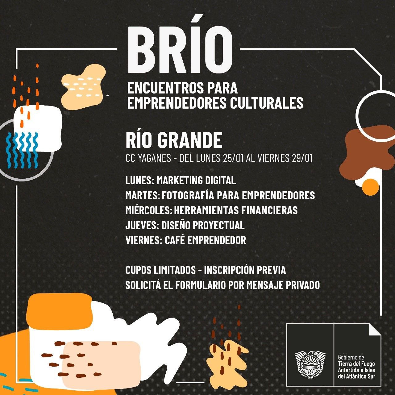 Rio Grande 20/01/2021.- BRÍO busca potenciar el crecimiento de emprendimientos culturales a través de una serie de actividades durante los meses de enero y febrero y será dirigida a toda la comunidad de emprendedores de distintos campos. En esta oportunidad, a partir del lunes 25 y hasta el viernes 29 de enero se estarán desarrollando diferentes encuentros con inscripción online y cupos limitados en la ciudad de Río Grande. Las inscripciones se realizan a través de las redes de Cultura TDF