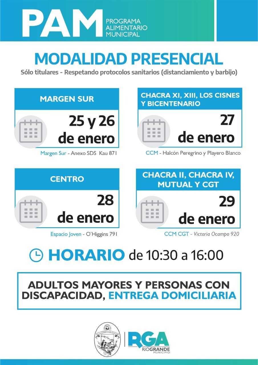 De esta manera, en el horario de 10:30 a 16:00 horas, la entrega continúa hoy miércoles 27 de enero en el Centro Comunitario Municipal de Chacra XI (Halcón Peregrino y Playero Blanco) para los vecinos y vecinas de Chacra XI, Chacra XIII, Los Cisnes y Bicentenario; luego el día jueves 28 de enero, para la zona Centro de la Ciudad, la distribución se realizará en Espacio Joven (O’ Higgins 791); y finalmente el viernes 29 de enero se entregarán módulos en el Centro Comunitario Municipal del barrio CGT (Victoria Ocampo 920), para los barrios CGT, Chacra II, Chacra IV y Mutual.