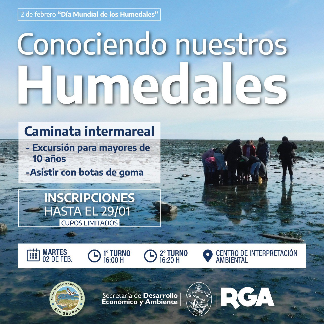 Rio Grande 25/01/2021.- En el marco del Día Internacional de los Humedales, el Municipio, a través de la Secretaría de Desarrollo Económico y Ambiente, invita a la comunidad a una caminata intermareal a realizarse el próximo 2 de febrero, partiendo desde CIA (Centro de Interpretación Ambiental).