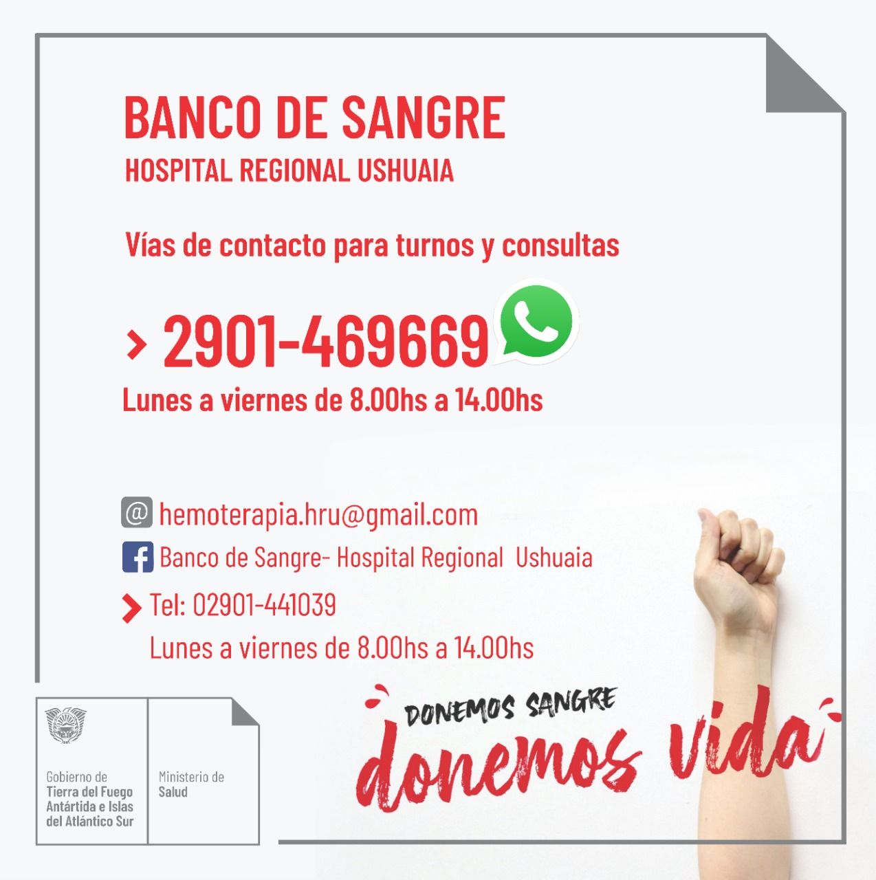 El Banco de Sangre del Hospital Regional Ushuaia habilitó una línea de WhatsApp para que las personas que deseen donar sangre puedan sacar turno de manera cómoda y rápida.
