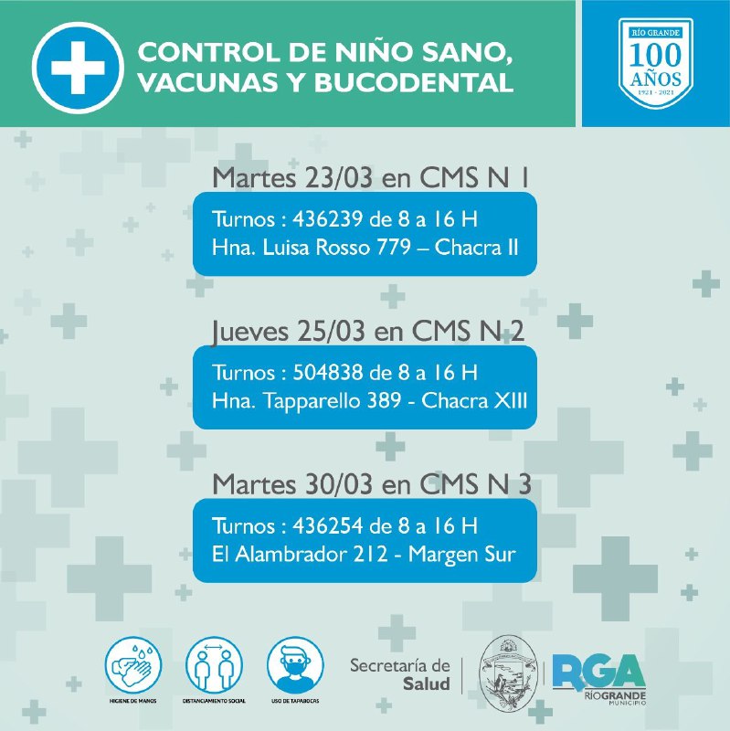 Rio Grande 22/03/2021.- A través de la Secretaría de Salud, el Municipio de Río Grande informa a los vecinos y vecinas que a partir de mañana, martes 23 de marzo, comienzan en los Centros de Salud Municipales los controles médico/odontológicos para el ingreso escolar, tales como: circuito integral de control de salud en niño sano; control de calendario nacional de vacunación y control bucodental .