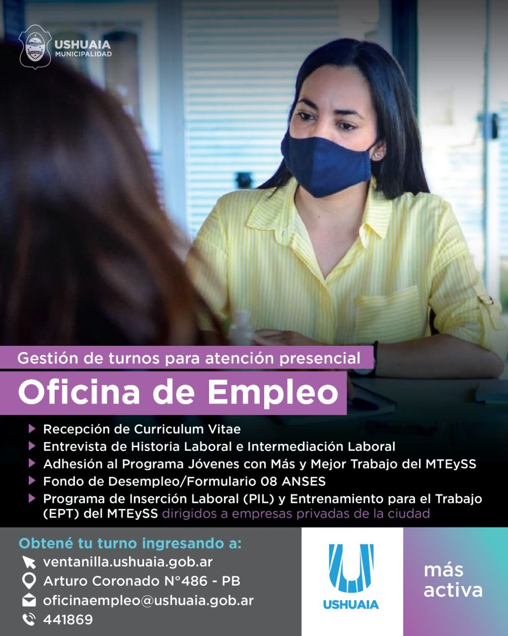 Ushuaia 28/03/2021.- La Oficina de Empleo de la Municipalidad de Ushuaia volverá a brindar su servicio de atención al público de forma presencial en las oficinas de la calle Arturo Coronado 486. Se recuerda a los vecinos y vecinas de la ciudad que para acceder a los diversos turnos, deberán ingresar a la Ventanilla Digital que encontrará en el sitio web de la Municipalidad, www.ushuaia.gob.ar.
