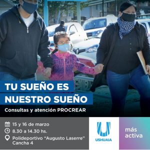 Rio Grande 14/03/2021.- Este lunes 15 y martes 16 de marzo, la Municipalidad de Ushuaia llevará adelante el final del Operativo Verano ANSES y junto a la Secretaría de Hábitat y Ordenamiento Territorial, una jornada en simultáneo de consultas y atención sobre el PROCREAR en el Polideportivo “Augusto Laserre” Cancha 4 de la ciudad. Las jornadas arrancarán a partir de las 8.30 h, y se extenderán hasta las 14.30 h.
