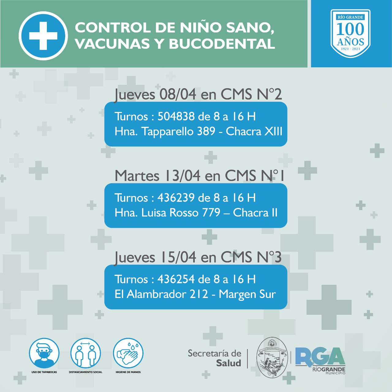 De la misma manera, el próximo jueves 15 de abril se estarán realizando los controles de ingreso escolar en el Centro Municipal de Salud Nº3 de Margen Sur (El Alambrador 212). Para turnos, los interesados deben contactarse al teléfono 436254, en el horario de 8 a 16.